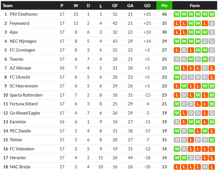 21/12/25 แพ้ พีเอสวี 1-2 (เหย้า) พรีเมียร์ดัตช์ / รอง 0.5 ...เสีย
