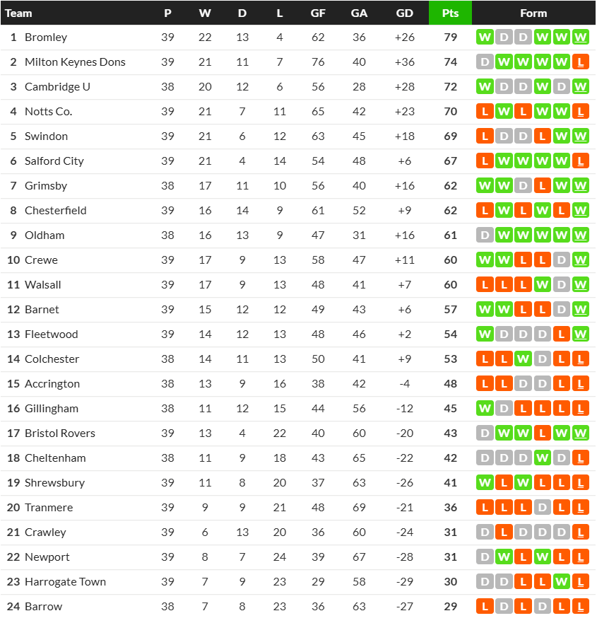 21/03/26 แพ้ โอล์ดแฮม 0-1 (เยือน) ลีก ทู / รอง 0.75 ... เสียครึ่ง