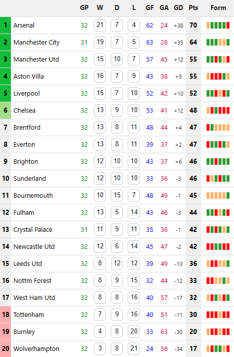 11/04/26 แพ้ ไบรท์ตันฯ 0-2 (เหย้า) พรีเมียร์ลีก / รอง 1 ... เสีย